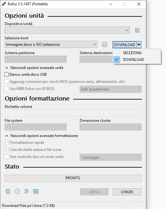 - alla voce “Selezione boot” scegli “Immagine disco o ISO”, poi clicca sul pulsante “Download” che si trova a destra: da qui potrai scegliere quale versione di Windows 10 scaricare