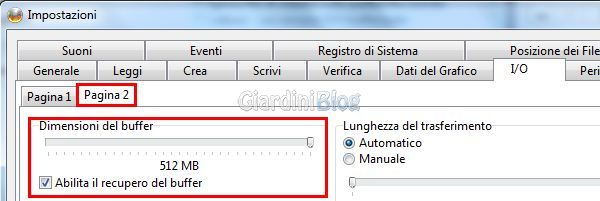 Ora clicchiamo su “Pagina 2” e portiamo le dimensioni del buffer a “512 MB“
