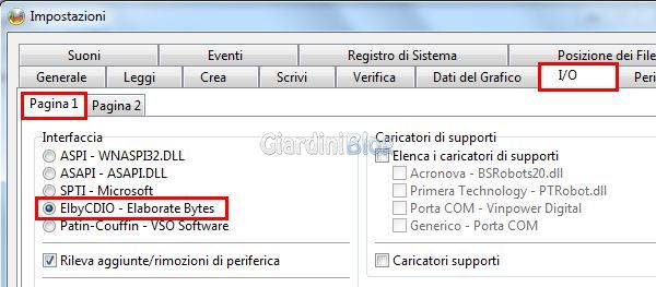 Ora passiamo al Tab “I/O” in “Pagina 1” impostiamo a interfaccia “ElbyCDIO Elaborate Bytes“
