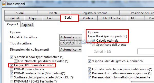 Qui non dovremo fare altro che accertarci che sia abilitata la voce “Esegui OPC prima di scrivere” e a “Opzioni” “Layer Break (per supporti DL)” lasciare la voce “Calcola ottimale” come sotto: