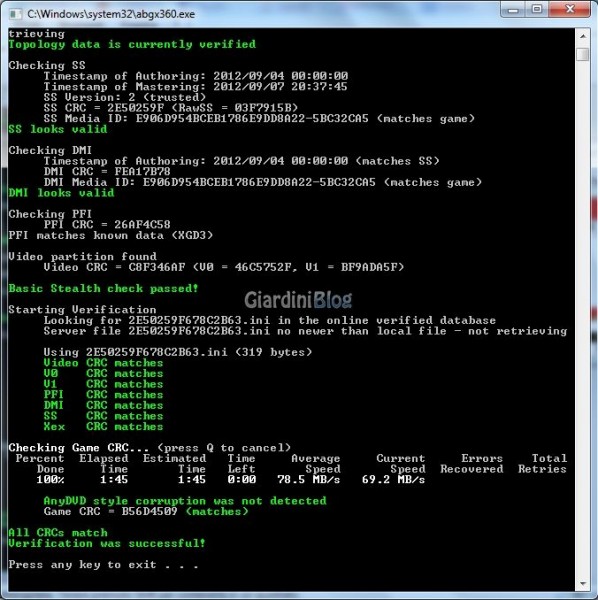 Il risultato di abgx360, dovrebbe essere quello mostrato nella figura seguente. Se così non fosse, eseguite una seconda volta il controllo sulla ISO.