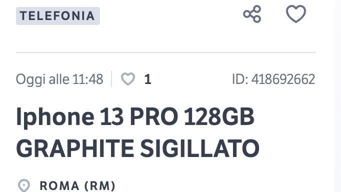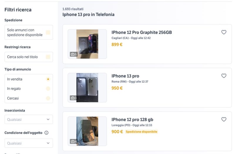 Facciamo un esempio concreto: se stai cercando un iPhone 13 Pro, che nuovo costa 1189 euro e usato mediamente si trova attorno ai 1000 euro, probabilmente se qualcuno te lo offre a 700 o 800 euro sta provando a fregarti.