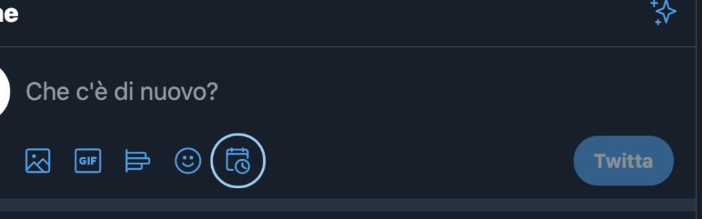 - quando hai completato la scrittura del tweet, NON cliccare su Twitta ma guarda nei simboli in basso: noterai un nuovo pulsante, con il simbolo di un'agenda e un orologio: cliccaci sopra