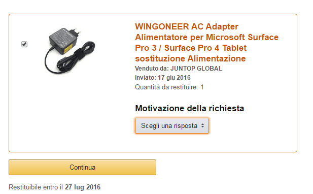 Una volta selezionato il prodotto da restituire alla voce Motivazione della richiesta su Scegli una risposta dovete selezionare una voce tra quelle presenti in elenco.