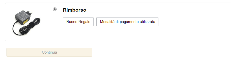 Poi selezioniamo la modalità di restituzione del denaro usato che può essere come Buono Regalo, riceverete un codice via mail, oppure con riaccredito sulla Modalità di pagamento utilizzata.