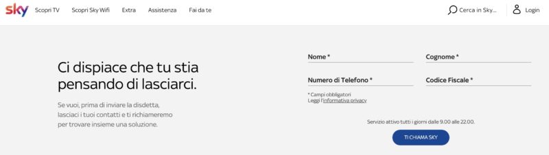 Se anche tu vuoi provare ad inviare disdetta a Sky per ottenere un'offerta migliore sul tuo abbonamento, ti basterà andare in QUESTA PAGINA del sito di Sky.
