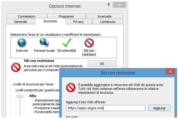 Dalla finestra che compare, cliccate sulla scheda “Sicurezza”, poi sulla voce “Siti con restrizioni” e, infine, su “Siti”.
