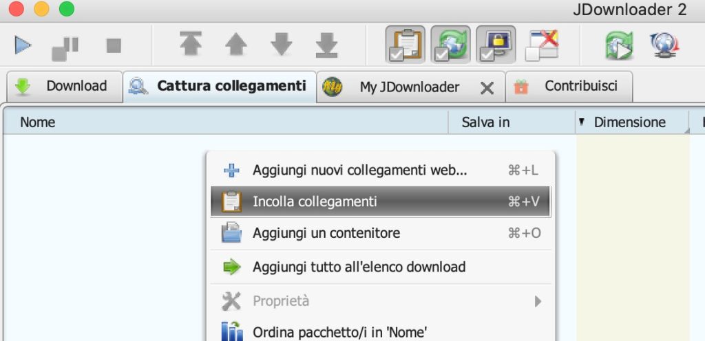 - ora che hai il link, vai su jDownloader, recati nella scheda CATTURA COLLEGAMENTI, clicca in un punto qualsiasi della schermata e clicca su INCOLLA COLLEGAMENTI nella finestra che si apre