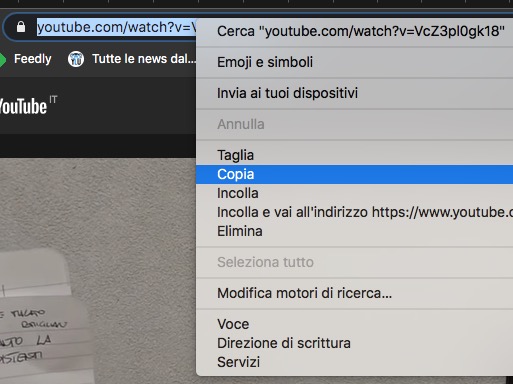 Se non sai come copiare un URL, guarda l'immagine seguente (è riferita a YouTube, ma il procedimento non cambia). Vai nella barra in alto del browser, dove c'è l'indirizzo di PornHub, cliccaci sopra col tasto destro del mouse e, nella finestra che compare, clicca sulla voce COPIA.