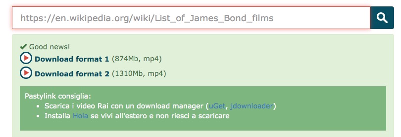 - Pastylink a questo punto ti mostrerà uno o più link per il download del video: basta un click sulla scritta “download” ed il gioco è fatto. Come potrai notare, i due link hanno un peso diverso: ovviamente quello più pesante ha una maggiore risoluzione. Scegli tu quello che preferisci scaricare
