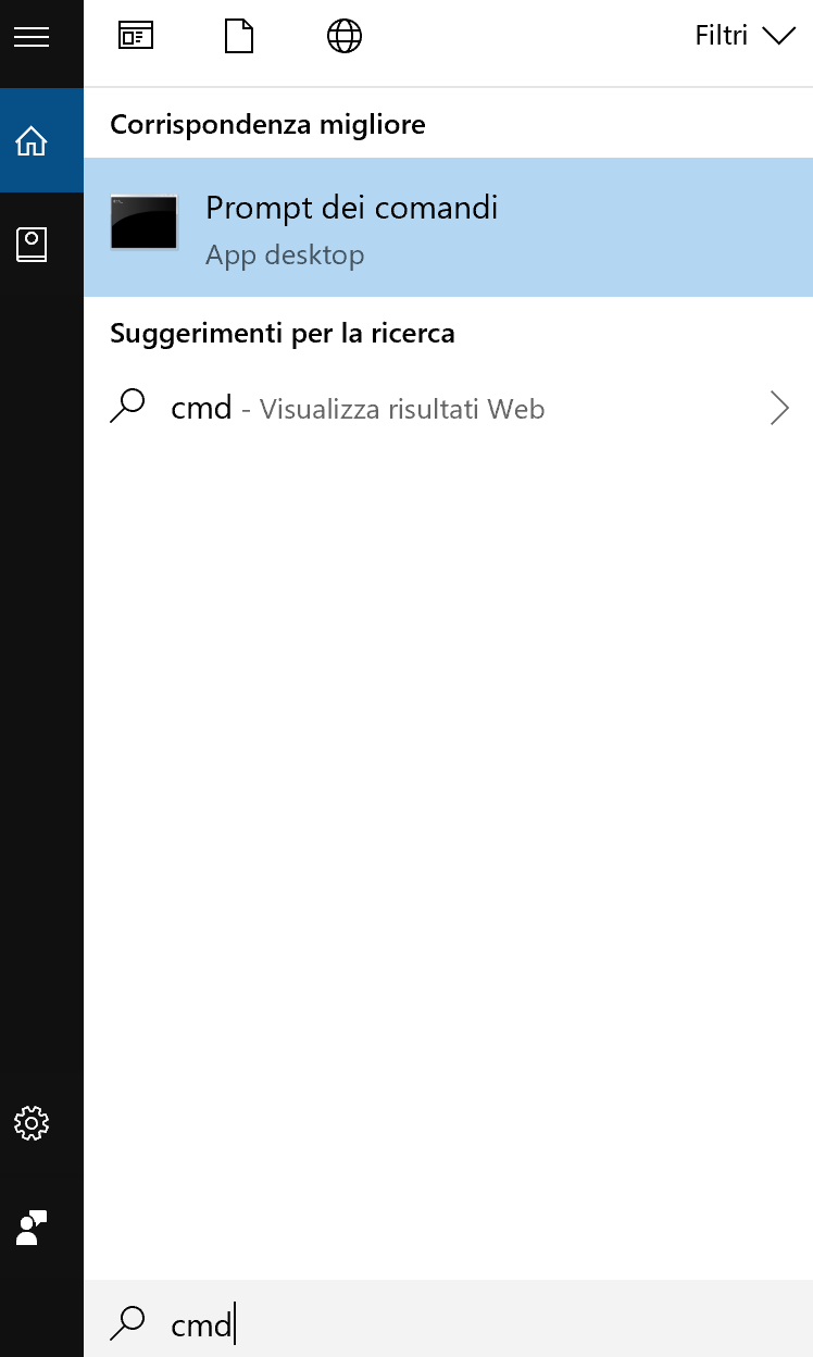 Fatta questa doverosa premessa, per accedere al comando IPCONFIG dobbiamo usare il Prompt dei comandi di Windows. Possiamo accedere al Prompt dei comandi di Windows scrivendo CMD in Esegui o Cerca programmi e File oppure in Cortana e poi avviare il Prompt cliccando sulla piccola icona nera.