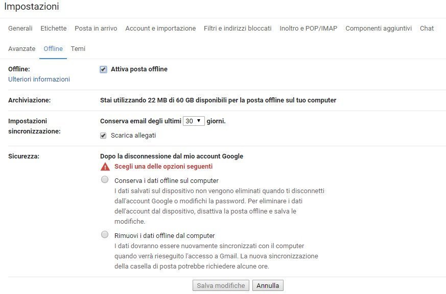 La funzione "attiva posta offline" sincronizza le informazioni con i server di Google ogni volta che ci colleghiamo ad internet.