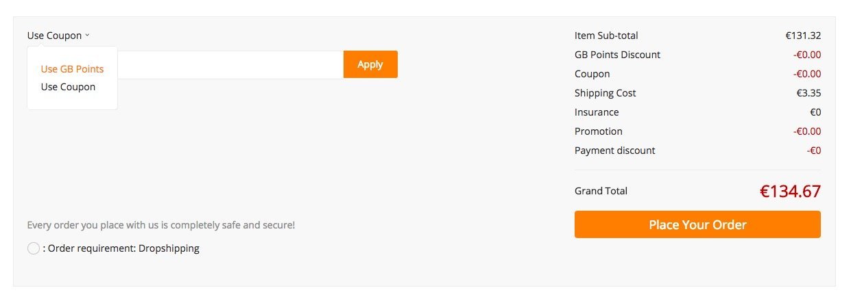 In questo modo potrai inserire un codice coupon oppure potrai scegliere quanti punti GearBest usare per risparmiare sul tuo acquisto.