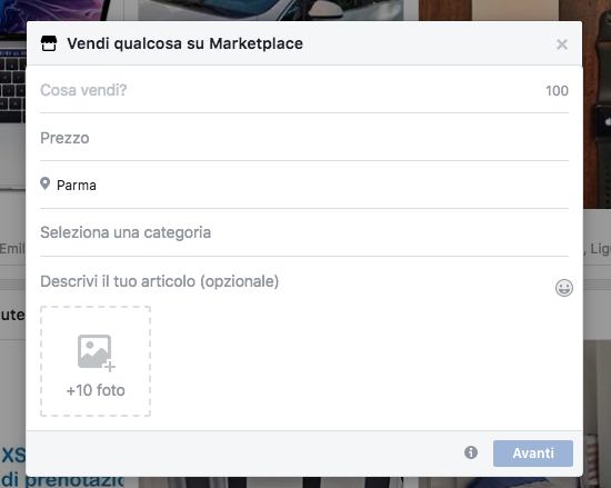 Ecco un'anteprima di come appare la finestra in cui devi inserire tutte queste informazioni su Facebook Marketplace:
