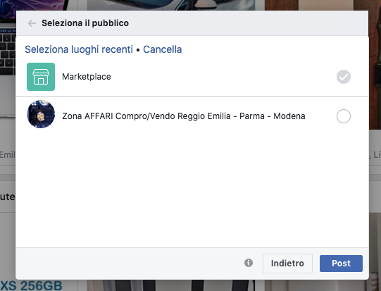 Si aprirà una nuova finestra dove dovrai selezionare la voce Marketplace (solitamente è già spuntata) e potrai pubblicare il tuo annuncio cliccando su Post in basso a destra.