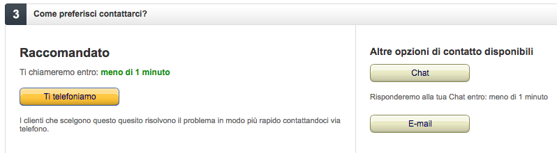 - dall'ultima finestra che compare alla fine della pagina, scegli il metodo che preferisci per contattare Amazon