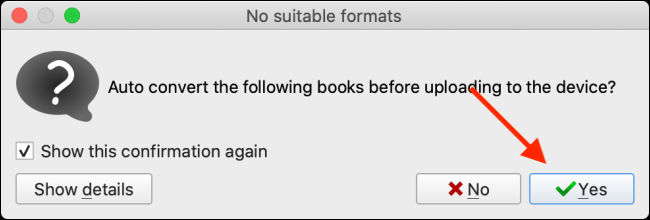 - Se i libri che hai selezionato erano in formato Mobi, saranno trasferiti in un istante. Se erano in formato ePub, invece, Calibre ti chiederà di convertirli. Quando ti compare la richiesta di conversione, acconsenti, come da immagine