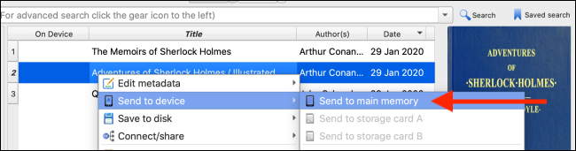 - Ora devi solo selezionare i libri che hai appena trascinato in Calibre, cliccare su di essi col destro del mouse e cliccare su “Send to Device” > “Send to Main Memory” quando richiesto, come da immagine: