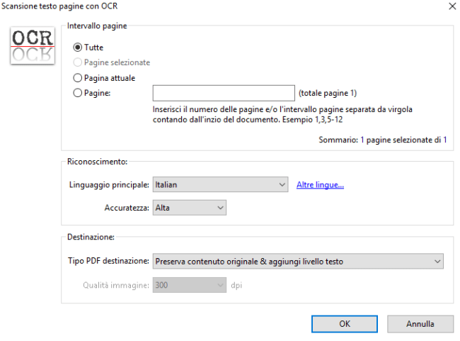 - Andate nel menu Documento -> Scansione testo pagine con OCR e settare le impostazioni come nell'immagine seguente: