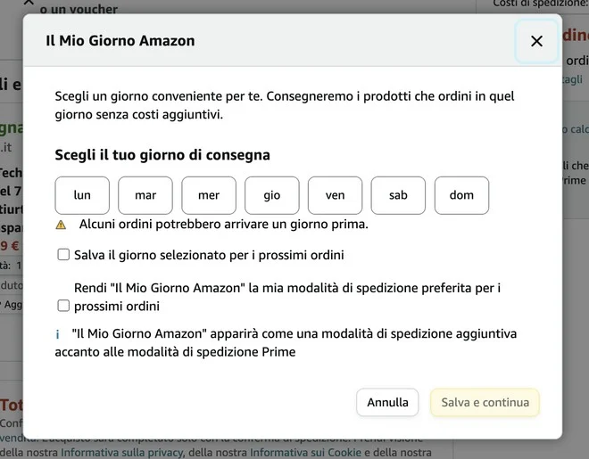 “Il mio giorno Amazon”, dunque, si sceglie e si modifica solo al momento dell'acquisto di un bene.
