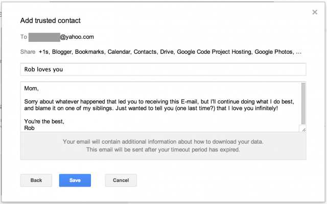 - questi contatti che hanno ricevuto l'avviso (impostati da voi) avranno un accesso limitato al vostro account Google (in base ai permessi che voi darete) e potranno accedere alle informazioni che voi avete selezionato. Potete anche fare in modo che ogni singolo contatto abbia accesso ad un determinato servizio di Google e abbia un messaggio predefinito ad accoglierlo nel momento in cui fa il login per recuperare i vostri dati (una sorta di testamento virtuale quindi)
