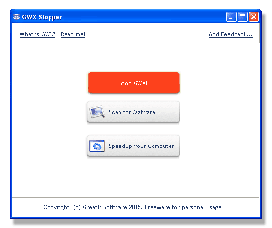 Se invece GWX.exe viene rilevato, GWX Stopper mostrerà il pulsante rosso "Stop GWX!": una volta cliccato, questo pulsante provvederà a disattivare GWX.exe in maniera definitiva. In questo modo, infatti, il processo di sistema non sarà più eseguito e conseguenza che non verrà più visualizzata la notifica "Ottieni Windows 10".