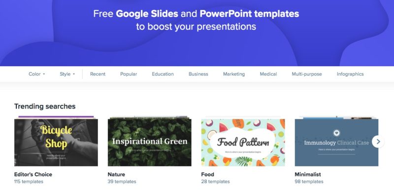 Un sito molto completo che permette di scaricare template per PowerPoint, Google Slides e Keynote. Basta registrarsi gratis per scaricare tutto il materiale contenuto al suo interno (ci sono anche temi a pagamento, non solo gratuiti).