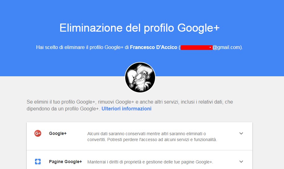 Per cancellarsi da Google+ definitivamente dovete andare alla pagina dedicata all'operazione di cancellazione che vi informerà su tutte le attività che verranno eseguite se si fa click sul pulsante ELIMINA presente in fondo alla pagina.