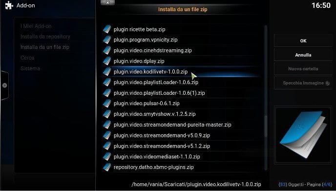 - ora dovrete cercare il file plugin.video.kodilivetv-xxx.zip nella cartella in cui l’avete scaricato: una volta che l'avete trovato, installatelo cliccandoci su una sola volta