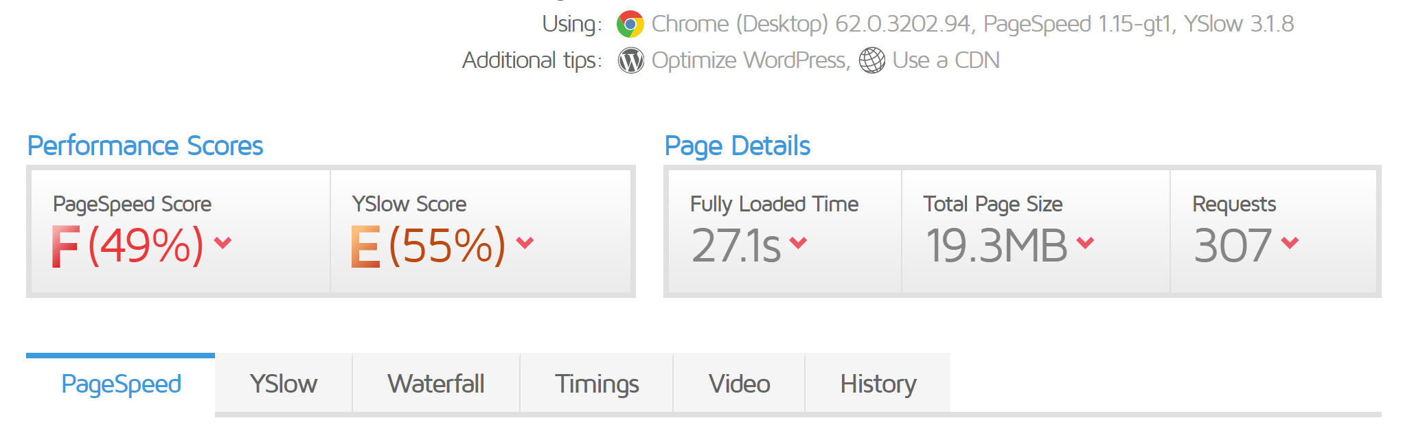 Il report di GTMetrix mostra una pagina principale, la home screen, notevolmente pesante, con contenuti scaricati pari a quasi 20MB e tempi di caricamento, di oltre 27 secondi.