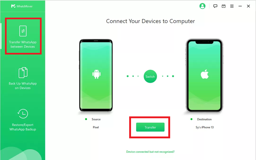Per trasferire i messaggi WhatsApp da Android a iPhone, seleziona Trasferisci WhatsApp tra Dispositivi (Transfer WhatsApp between Devices) su WhatsMover e collega i tuoi dispositivi Android e iPhone al PC utilizzando i cavi USB. Controlla che i dispositivi di destinazione e di origine siano corretti.
