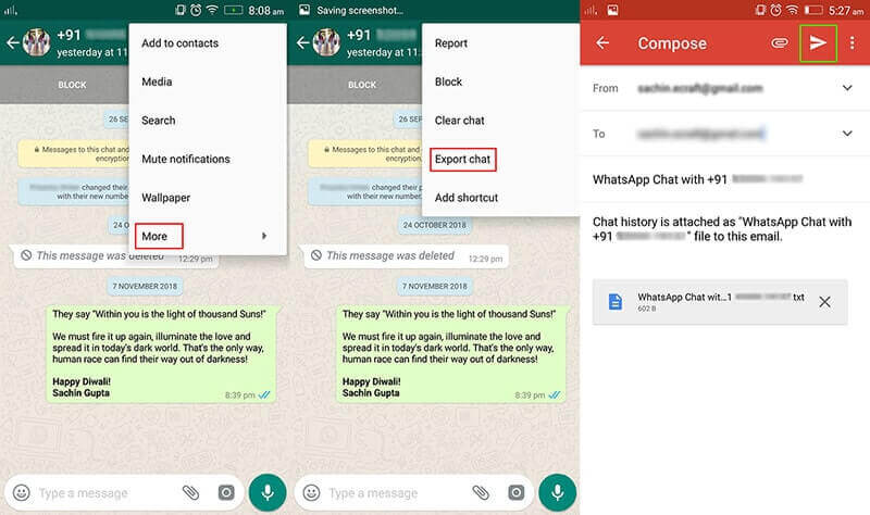 Puoi anche usare l'e-mail per trasferire i dati di WhatsApp da un telefono Android a un iPhone. Tutto ciò che devi fare è inviarti via e-mail le chat di WhatsApp dal tuo telefono Android e poi scaricarle sul tuo iPhone.