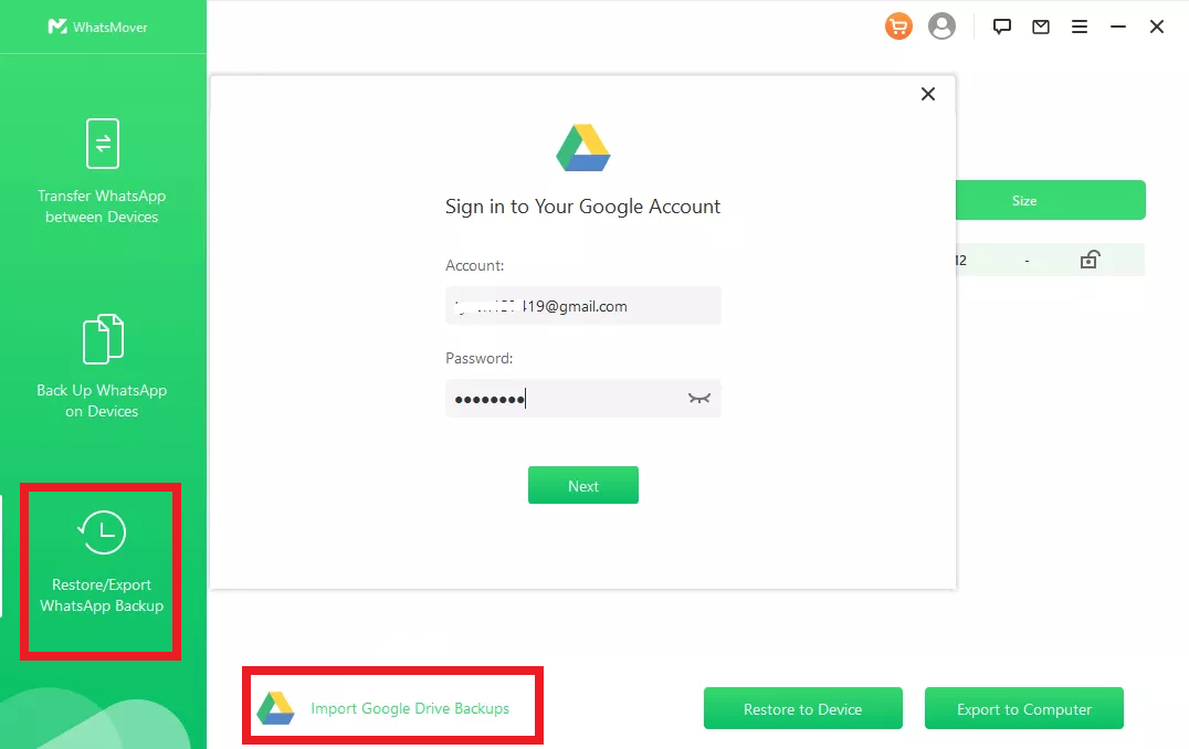 Vai al riquadro di sinistra e seleziona Ripristina/Esporta Backup di WhatsApp (Restore/Export WhatsApp Backups). Clicca su Importa Backup di Google Drive (Import Google Drive Backups) nell'angolo in basso a sinistra e accedi al tuo account Google.