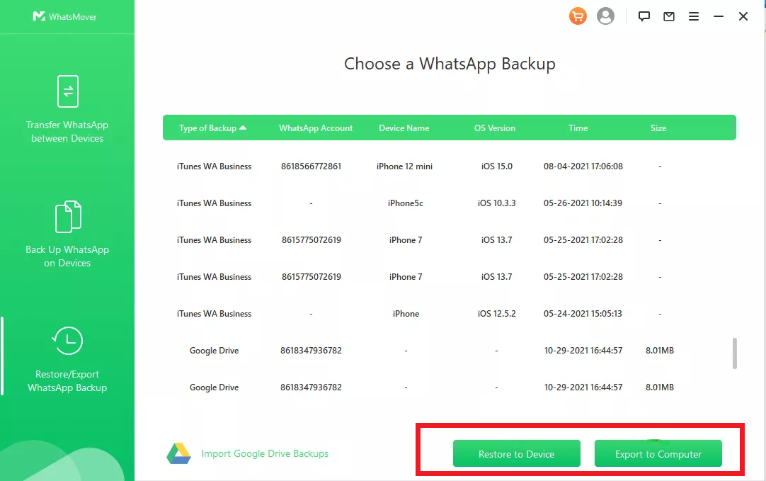 WooTechy WhatsMover può scaricare i backup di WhatsApp da Google Drive e poi ripristinarli sul tuo iPhone o sul tuo Android. Non esiste alcuna limitazione per quanto riguarda l'account WhatsApp e il sistema operativo. La percentuale di successo è altissima e la privacy dei dati è assicurata.