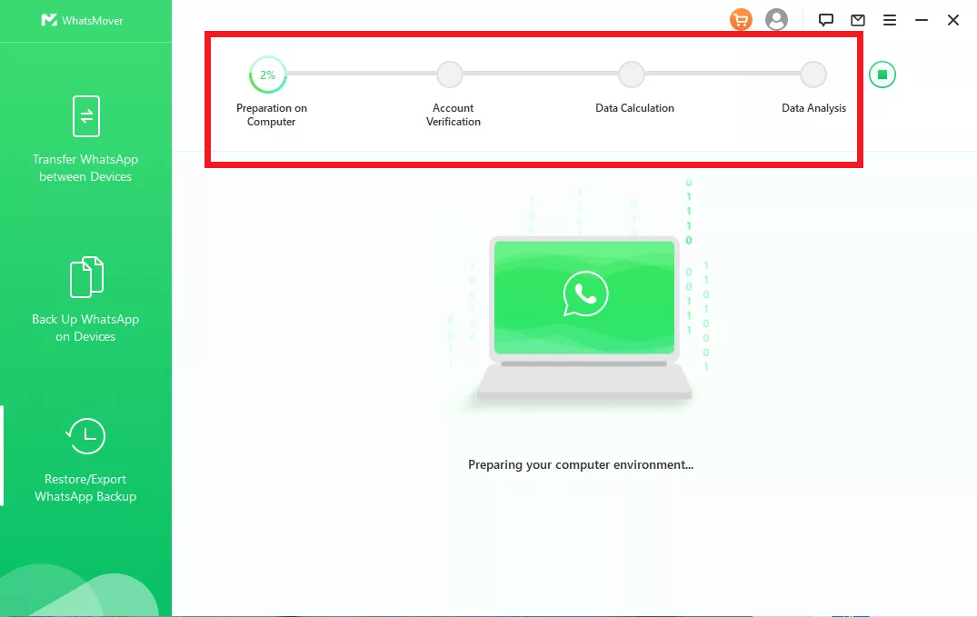 A seconda delle tue necessità, fai clic su Ripristina sul Dispositivo (Restore to Device) nell'interfaccia. Verrà avviata una procedura di valutazione che prevede quattro fasi: la preparazione sul computer, la verifica dell'account, il calcolo dei dati e l'analisi dei dati.