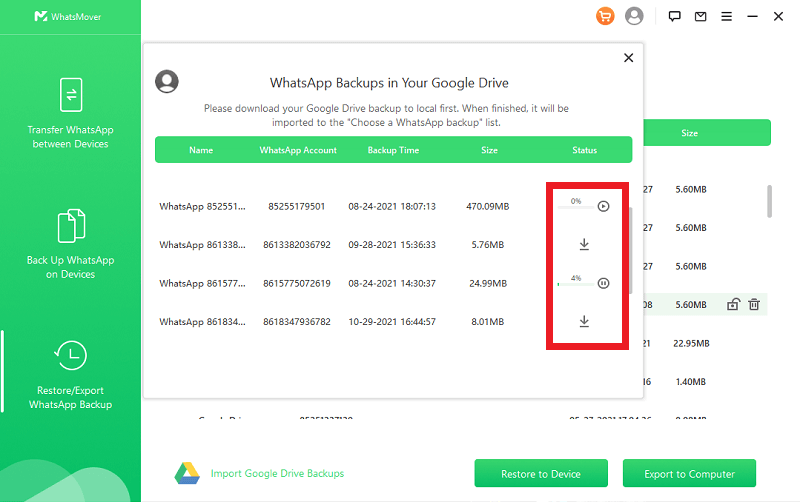 Verrà visualizzato un elenco di backup di Google Drive per WhatsApp. Seleziona il backup che desideri e fai clic sull'icona di Download che trovi accanto al backup prescelto.