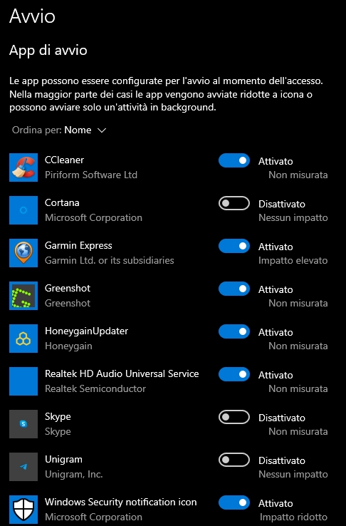 - Mettere la spunta "Disattivato" su tutti quei programmi che NON si devono avviare all'accensione di Windows. Consiglio di disattivarne il più possibile e di lasciare attivi solo quelli indispensabili.