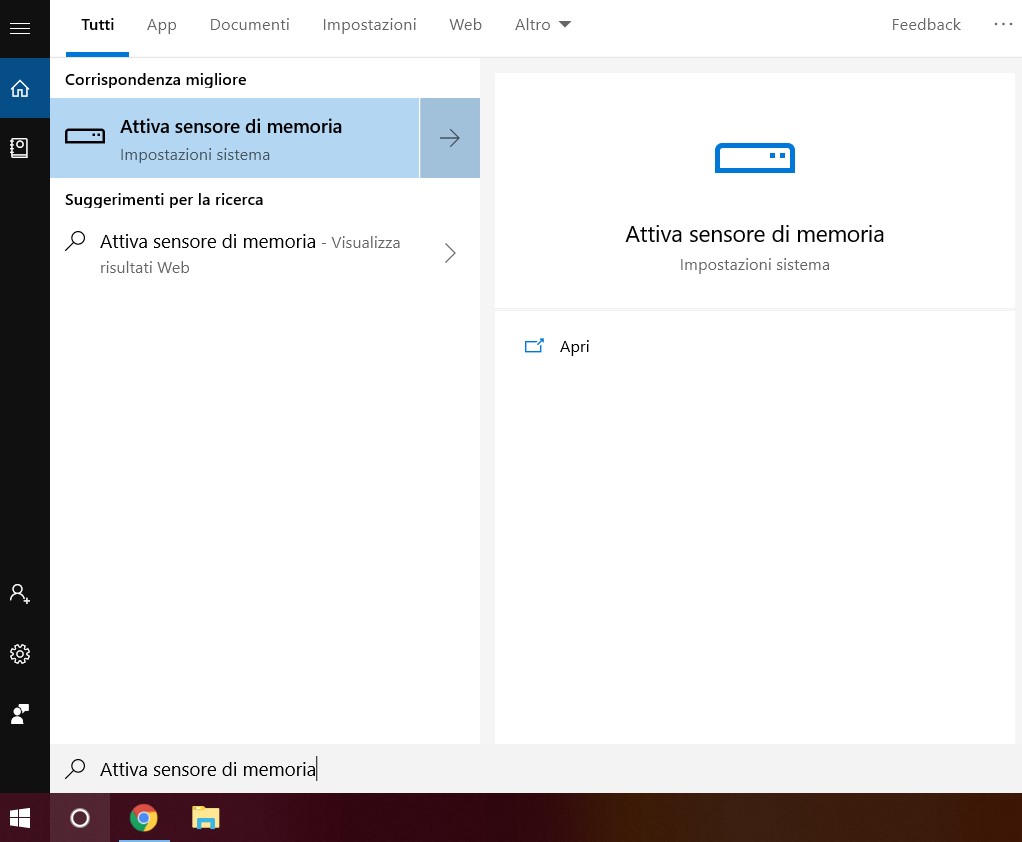 - Digitare "Attiva sensore di memoria" nella casella di ricerca di Windows 10 in basso (il cerchio che richiama anche Cortana).