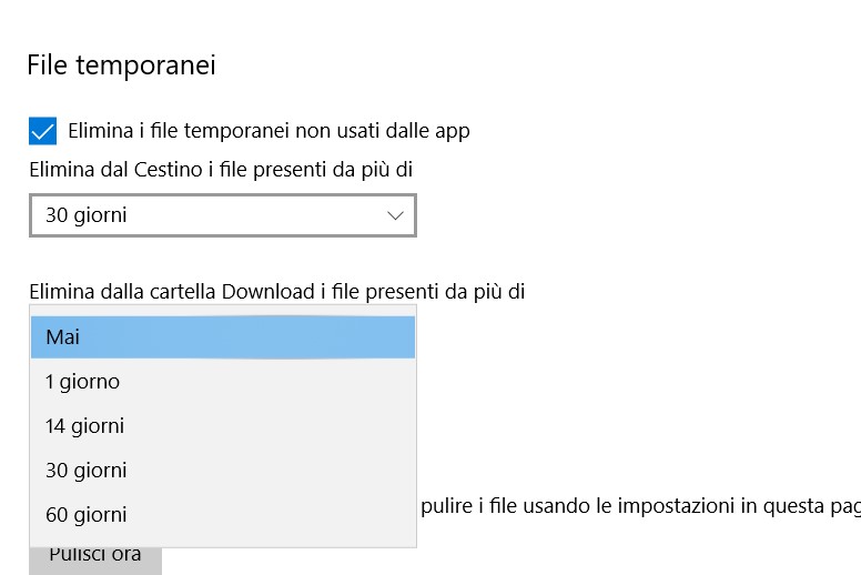 - Ora nella sezione File temporanei "Elimina dalla cartella Download i file presenti da più di" seleziona dal menu a tendina scegliere Mai.
