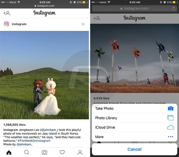 NOTA: questa procedura NON è necessaria su iPad visto che il sito mobile di Instagram è già ottimizzato per il tablet di Apple e ora mostra nativamente il pulsante per condividere e caricare nuove foto.