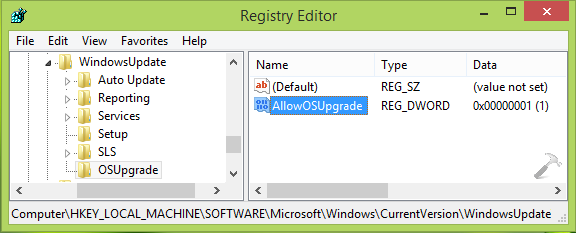 - Se la chiave non esiste dovete creare una nuova con valore DWORD (32-bit) con Name = AllowOSUpgrade e se esiste già dovete impostare il valore a 1 o valore esadecimale 0x00000001.