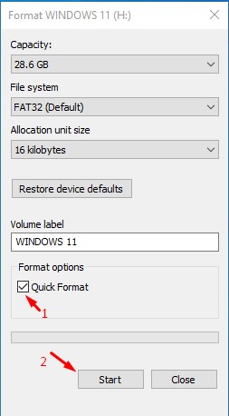 Nella schermata che si apre, seleziona ‘Quick Format’ e conferma tutto cliccando sul pulsante ‘Start‘.
