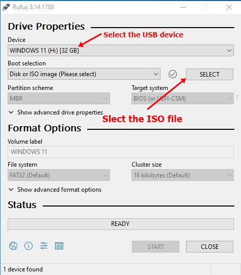 - nel campo Boot Selection, clicca su ‘Select’ e seleziona il file ISO di Windows 11 che hai scaricato in precedenza