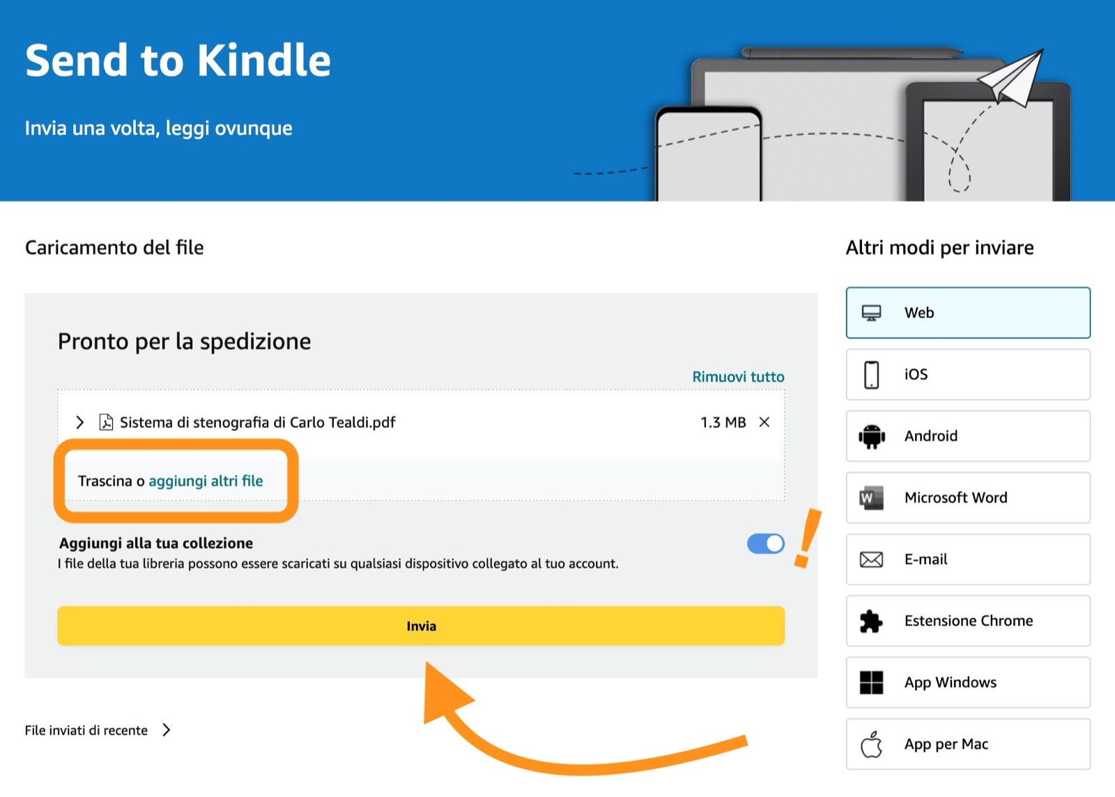 Fortunatamente negli ultimi mesi Amazon ha deciso di risolvere anche questo problema, rilasciando un tool ufficiale che permette di inviare qualsiasi libro o ebook Kindle in modo facile e veloce, compresi quelli scaricati da internet al di fuori dello store ufficiale.