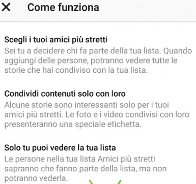 Basta un tap sull’icona per arrivare alla “Lista Amici più stretti”, che permette, in sostanza, di fare una selezione tra i tuoi follower, andando a scegliere se condividere una determinata Storia con tutti i tuoi follower, oppure soltanto con i tuoi “amici più stretti“.