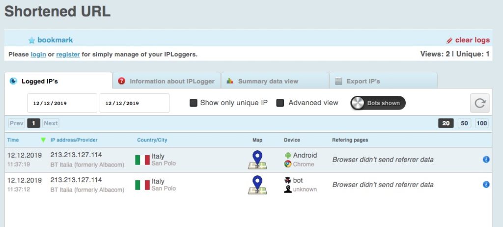 - dopo il refresh della pagina, compariranno in basso gli indirizzi IP delle persone che hanno cliccato sul link, la loro posizione, il dispositivo da cui è stato cliccato il link e altre informazioni