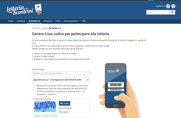 Dopo aver cliccato su Partecipa Ora, si verrà riportati ad una nuova pagina dove basterà inserire il proprio codice fiscale e inserire il captcha (codice di sicurezza). Subito dopo si verrà reindirizzati a a una pagina dove verrà mostrato il proprio codice lotteria, che potrà essere stampato o scaricato sul cellulare.