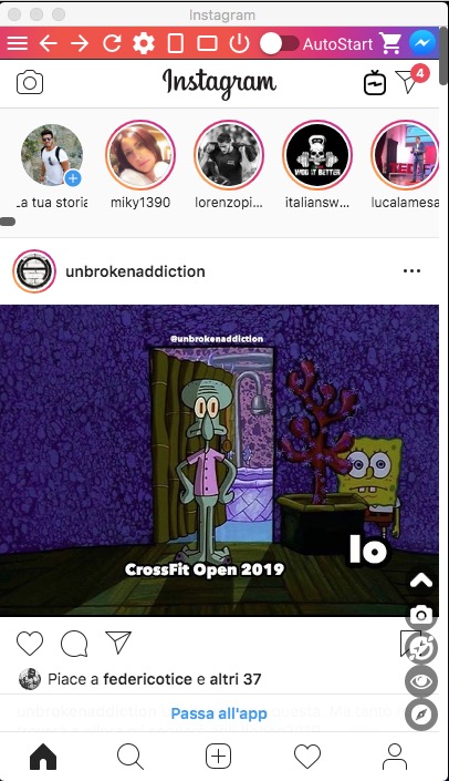 Ecco come si presenta l'app. Potrai avere Instagram in versione smartphone in una finestra fluttuante sul tuo PC Windows o Mac e avrai accesso a tutte le funzioni che solitamente trovi solo sul telefono, compresi ovviamente i DM e la chat di Instagram.