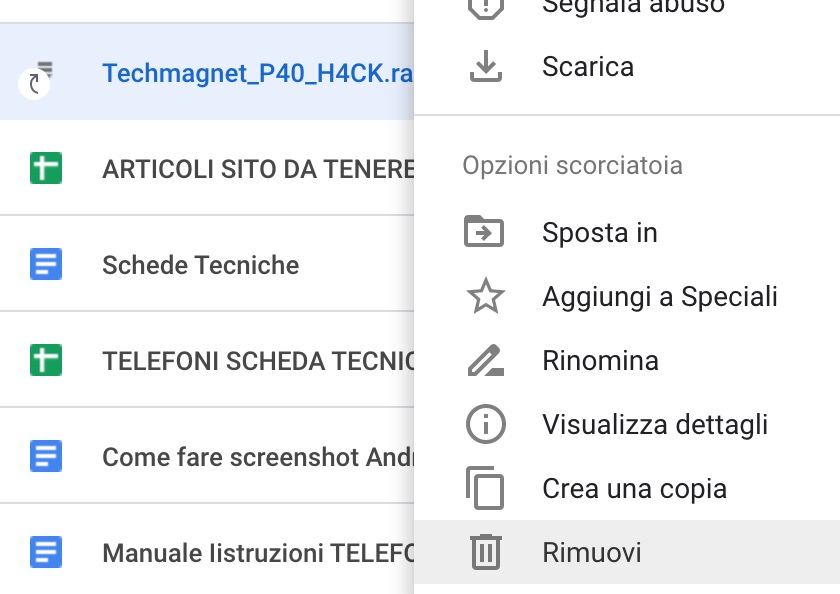 - tra i vari file presenti sul tuo Drive, troverai sicuramente quello che hai appena aggiunto (è contraddistinto da un'icona con una piccola freccia). Cliccaci sopra col destro del mouse e seleziona la voce RIMUOVI