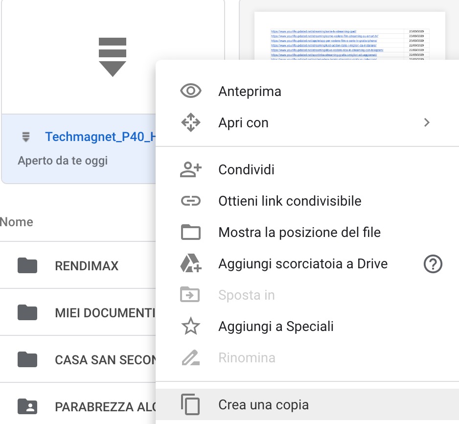 - a questo punto, nella parte alta della pagina di Google Drive (nei file recenti), dovresti avere ancora il collegamento al file. Cliccaci sopra col destro del mouse e seleziona la voce CREA UNA COPIA